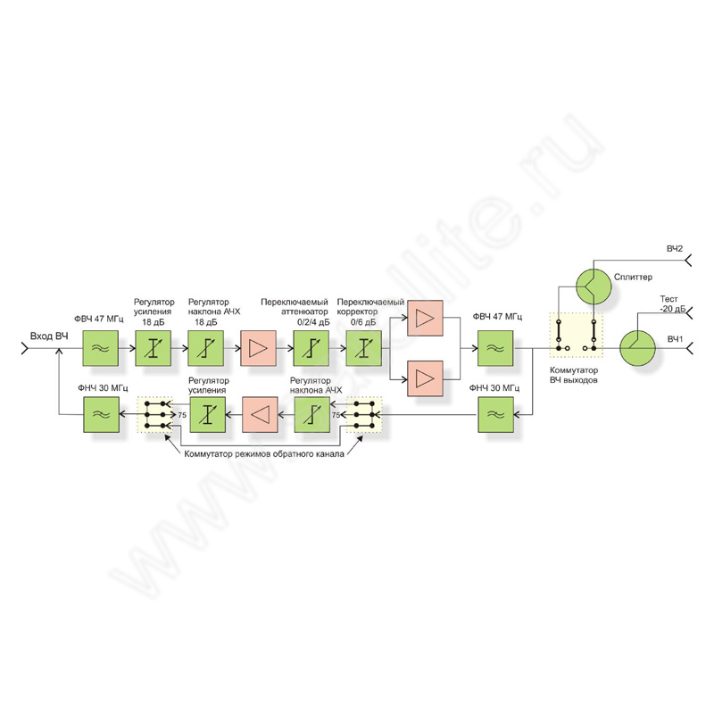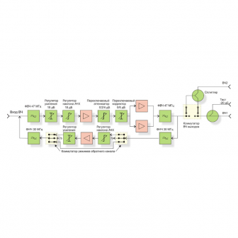 - тракт обратного канала с диапазоном рабочих частот 5…30 МГц с плавной регулировкой усиления и наклона АЧХ, имеющий три режима работы (пассивный, активный, выключено).